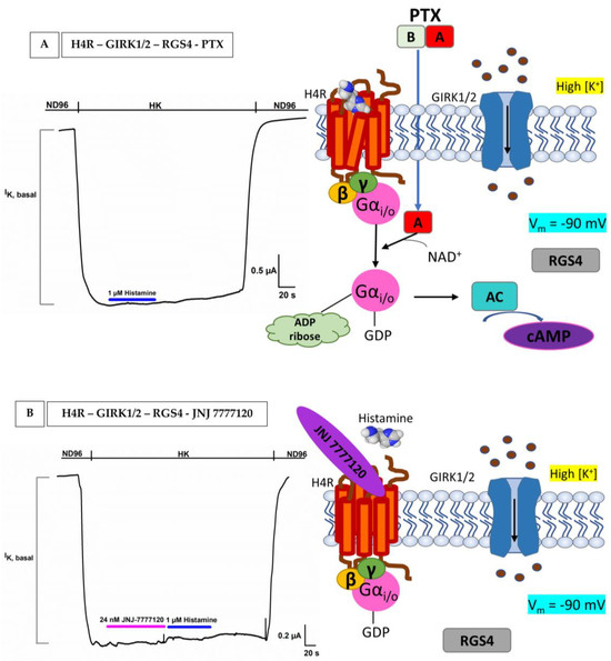 K, histamine) could be completely blocked by a specific H4R antagonist, JNJ 7777120, using oocytes co-injected with H4R-GIRK1/2 and RGS4. Taking everything together, it is notable that the system nicely mimics the physiological reality of H2R/H3R/H4R coupling with GIRK1/2-RGS4.