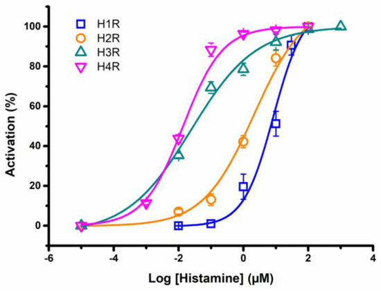The dose–response curve of H1R, H2R, H3R, and H4R was made by exposing oocytes to an increasing histamine concentration until the maximum response was observed. The histamine-evoked currents were measured at each concentration and normalized against the saturated histamine-evoked current.