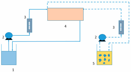 Schematic view of the hollow fibre membrane process for extracting metals contained in the rinse water. 1—feed phase vessel. 2—pumps. 3—flow-meters. 4—hollow fibre module. 5—pseudo-emulsion vessel.