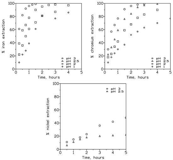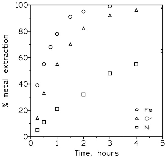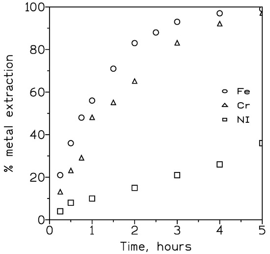 These results showed that for both metals, an increase in the extractant concentration from 20 to 60% v/v was accompanied by an increase in the metal extraction rate at any elapsed time. It should be noted that the reaction time required to reach 99% extraction increased with the decrease in the extractant concentration. In the case of 60% v/v solution and iron(III), the time required was one hour against three hours for a solution of 20% v/v, whereas in the case of chromium(III), the time required was of one and a half hours and five hours for extractant concentrations of 60% v/v and 20% v/v, respectively, and similar dependences were reported in the literature [29,30,31]. In the case of nickel(II), the same effect was observed, though the percentage of nickel extraction at a fixed time was much lower than the values obtained for both iron(III) and chromium(III) (Table 5).