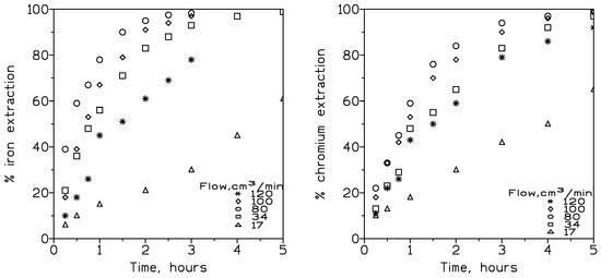 Iron(III) (left) and chromium(III) (right) extraction at various flow rates. Temperature: 20 °C.