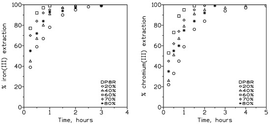 Iron(III) (left) and chromium(III) (right) extractions at various DP8R concentrations in the organic phase. Temperature: 20 °C.