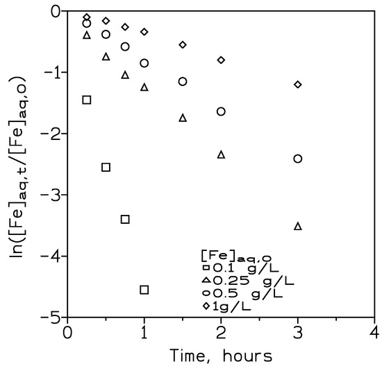 These values indicated that, in accordance with Equation (9), the flux value increased with the corresponding increase in the initial metal concentration in the solution [38], and the transport process was controlled by diffusion in the feed phase. This tendency was maintained up to 0.5 g/L concentration of iron(III), beyond which the metal flux became constant. This was probably due to a saturation of the fibre pores with the iron–extractant complex, which resulted in a lower effective membrane area [39].
