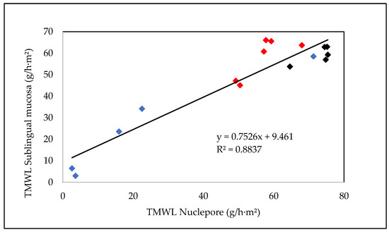 Correlation between the values of TMWL obtained with the Nuclepore artificial membrane and sublingual mucosa for the hydrophobic formulations (1, 2, 3, 4, and 5, in blue), hydrophilic formulations (6, 7, 8, 9, and 10, in black), and liposomal formulations (11, 12, 13, 14, 15, and 16, in red).