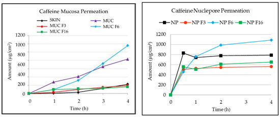 Results for virgin membranes were already presented in the previous section but some parameters are repeated in this section to be specifically compared with the ones of the modified membranes (Figure 2 and Table 5). As expected, the permeation of caffeine through the skin was very low due to the presence of the stratum corneum, which acts as a barrier, reaching approximately 10% after 4 h (SKIN). The higher permeability of the sublingual mucosa was also demonstrated in this case by the higher capacity of caffeine delivery, with 40% release at 4 h (MUC). Moreover, the Nuclepore membrane (NP) allowed the highest release with no barrier to compound passage. Caffeine crossed this membrane rapidly, and the maximum permeation (50%) was obtained between 0.5 and 4 h. The permeation of caffeine through the differently modified membranes was compared. The maximum permeation was obtained for both the sublingual mucosa and Nuclepore membranes modified with hydrophilic formulation 6 (F6) (4% sodium carboxymethyl cellulose gel). It should be noted that this formulation seemed to increase the permeation of caffeine in a parallel manner between the two membranes, reaching 60% with mucosa (MUC F6) and 65% with the Nuclepore membrane (NP F6) at 4 h. The lowest permeation with both membranes was obtained after modification with hydrophobic formulation 3 (lipophilic base MI) and liposomal formulation 16 (Cer3Cer6 10%). These two formulations caused the membranes to become impermeable. In the case of the sublingual mucosa (MUC F3 and MUC F6), permeation was very similar to that of the skin (10% at 4 h), and in the case of the synthetic membrane, it was 40% for the two formulations (NP F3 and NP F6) at 4 h. Although the permeation percentages for the sublingual mucosa and the synthetic mucosa modified with the three formulations are not the same, a similar trend was noted. To confirm this observation, the parameters maximum concentration (Cmax) and permeability coefficient (Kp) were calculated and are shown in Table 5.