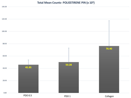 In Figure 1, we can see the total count of bacterial species present in the biofilm formed on polystyrene pins inside the membranes. The analysis was performed using checkerboard data, which involved adding up the count of each species within the evaluated groups. Although the pin surrounded by the collagen membrane had about 50% more biofilm compared to the two PDO membranes, there was no statistically significant difference in the average total counts of these three groups (p = 0.08).