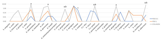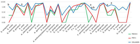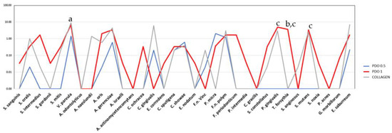 The mean counts of each species formed in the biofilm over the polystyrene pins covered by PDO 0.5, PDO 1.0, and Collagen. The Kruskal–Wallis test and Dunn’s (p ≤ 0.05) test were performed. The letter shows the difference between the membranes as follows: “a” shows the difference between PDO 0.5 and collagen; “b” between PDO 1.0 and collagen, and “c” between PDO 0.5 and PDO 1.0.