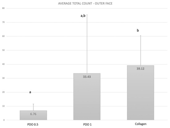 The mean and SD of total count means of the biofilm formed in the external part covered by the evaluated membranes. Kruskall–Wallis test (p ≤ 0.05) Letters show the difference between the membranes as follows: PDO 0.5 < PDO 1.0 = Collagen.