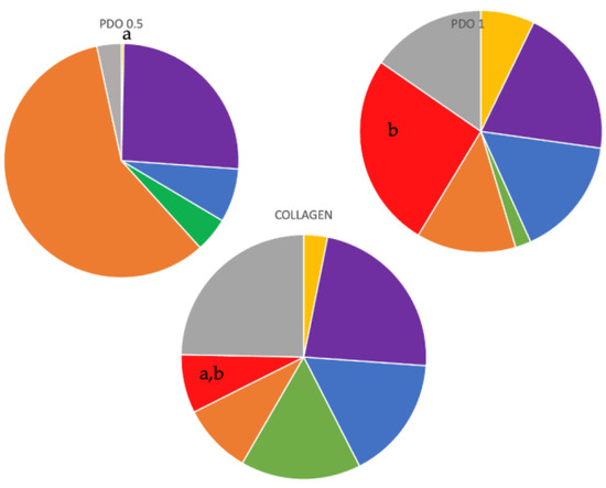An analysis of complex proportions was conducted for the following three situations: the pin inside the membranes and the internal and external sides of these membranes. For the pin inside and internal side situations, there were no statistical differences observed between any complex in any group. However, for the external sides of the membranes (as shown in Figure 7), the external side of the PDO 1 membrane had a significantly higher proportion than the external side of the PDO 0.5 membrane (p ≤ 0.05). No other statistically significant differences were observed between the complexes (p ≤ 0.05). Furthermore, the complex proportions of the collagen membrane did not show any significant difference from any other complex of any other membrane.
