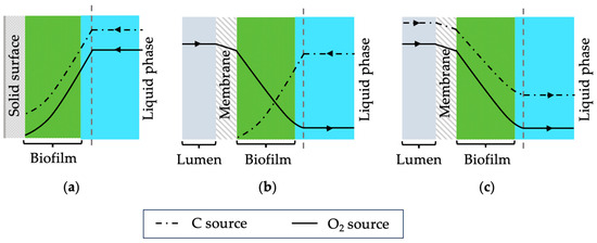 Figure 1a). In membrane biofilm reactors, substrates are delivered from both sides, resulting in distinct nutrient profiles. Depending on the concentration of nutrients and oxygen, the location of the biocatalytic activity within the biofilms can be controlled [