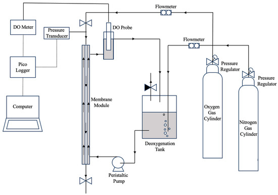 9] whereby two valves are connected at either end of the membrane module. Oxygen gas was introduced to the lumen of the membrane at a minimum flowrate of 200 mL/min, then the valves were closed to maintain the oxygen pressure in the membrane and allow oxygen to leave the lumen only through the membrane. High sensitivity pressure measurements were achieved by using a pressure transducer connected to a Pico Logger to record the pressure drop. For a given intramembrane pressure, the difference between the initial and final pressures indicates the change in mass of oxygen inside the membrane tube [