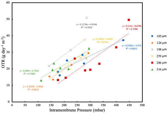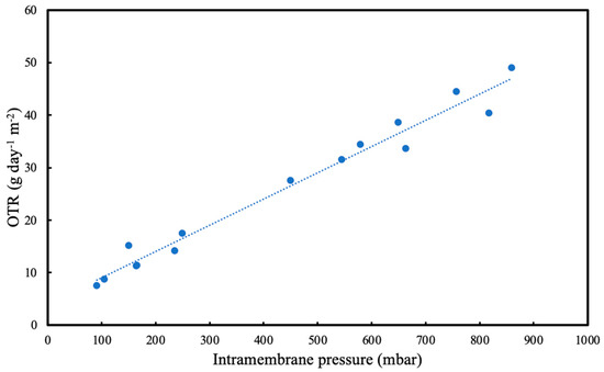 As the biofilm continues to grow, the dissolved oxygen concentration eventually falls to zero within the biofilm. Since the microorganism used in this study is aerobic, this could potentially lead to oxygen limitation. However, OTR results at various intramembrane pressures and biofilm thicknesses indicate that oxygen limitation is not a concern within the range of testing. Thus, it can be concluded that the resulting biofilm is entirely aerobic, and there were no instances of oxygen limitation throughout the experiments.