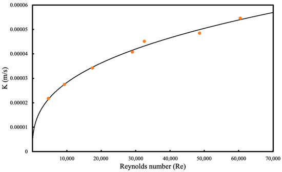 The Reynolds numbers in this study are in the turbulent range, higher than many studies that investigate the shell side mass transfer correlations. This is due to the small diameter of the membrane bioreactor column used in this study, which increases the liquid velocity within the bioreactor and causes the Reynolds number to be in the turbulent range. Using high Re numbers makes the liquid boundary layer resistance lower than the resistance caused by the membrane layer. Therefore, at elevated liquid velocities, the mass transfer coefficient (K) becomes independent of the Re. In the literature, the power of the Re number was reported between 0.3 and 0.93, which shows that the suggested correlation is comparable with the previously reported studies [