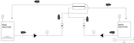 Before each forward osmosis test, the draw and feed tank were filled with the DS and FS, respectively. The pumps of the FS and DS were switched on and the flow rates were set (30 L·h−1 for both feed and draw circuits). Then, the conductivity meters were switched on, and the data logging was started. Also, the data logging of the values of weight was switched on. The two manometers should show values close to zero, as forward osmosis is a non-pressure-driven process. When the test was finished, data logging was stopped and the pumps were switched off.