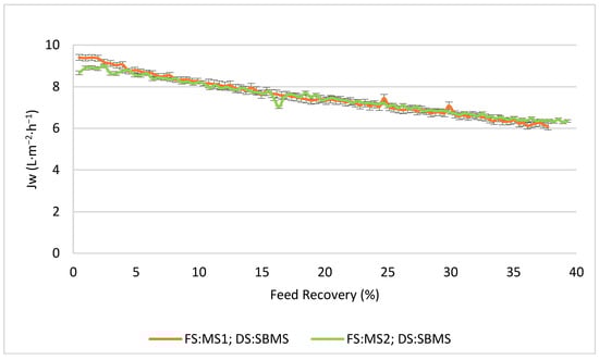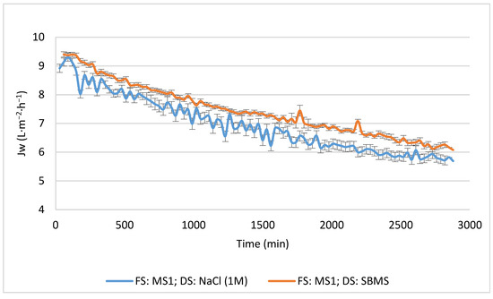 Figure 3 shows the comparison between NaCl and SBMS, with MS1 as the FS, in terms of the permeate flux. It can clearly be seen how both DSs presented a similar trend, starting with a permeate flux of over 9 L·m−2·h−1 and declining at approximately 34–35% after 48 h. The decrease in the permeate flux is generated mainly due to a decrease in the driving force in the FO process. This could be due to increasing salinity on the FS side and dilution on the DS side. Another factor to consider is the mode of operation. In this case, it was the active layer of the membrane facing FS (AL-FS). In this configuration, concentration polarization occurs within the porous FO support layer, called internal concentration polarization (ICP), which causes a decrease in the permeate flux [45,46].