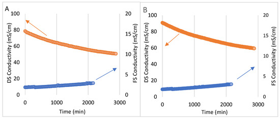 Conductivity of both draw solution (DS, in orange) and feed solution (FS, in blue) for test 1 (A) and test 2 (B), with FS and DS flow rates of 30 L·h−1. The arrows indicate which axis it corresponds to.