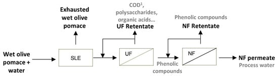 Schematic diagram of the recovery of phenolic compounds from wet olive pomace by the proposed integrated process consisting of solid–liquid extraction (SLE), ultrafiltration (UF) and nanofiltration (NF). 1 COD: chemical oxygen demand.