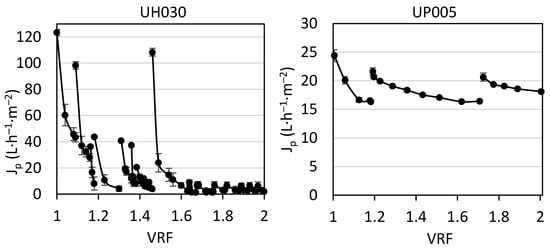From the third stage until the end of the global process (Figure 2), very similar values of permeate flux were exhibited by the UH030 membrane at the end of every stage. Each decline curve ended in low values of permeate flux, in the range of 1.3–5.4 L·h−1·m2, irrespective of the VRF. The concentration factor and applied rinsing or cleaning only influenced the capacity of removing the existent cake layer (in order to address the following stage), but the final value of the permeate flux was inevitably low. This, along with the results presented in Figure 3, motivated the selection of the UP005 membrane for the integrated process.