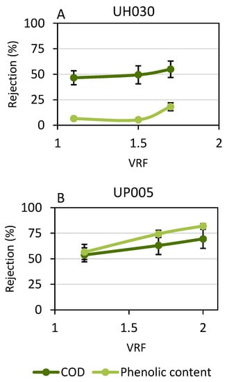The effect of the size exclusion phenomenon can be observed in the graphs presented in Figure 3. The UH030 membrane (Figure 3A) barely retained the phenolic content from the wet olive pomace because of its larger pore size. On the contrary, the obtained values for the rejection of the COD were higher, reaching 55 ± 8%. The increment in the rejection of the COD with the VRF occurred due to the strong fouling of the membrane that was previously commented on during the discussion of Figure 2. The high concentration of solutes near the membrane surface prompted the formation of an additional layer which contributed to the retention of large solids, such as proteins or polysaccharides.