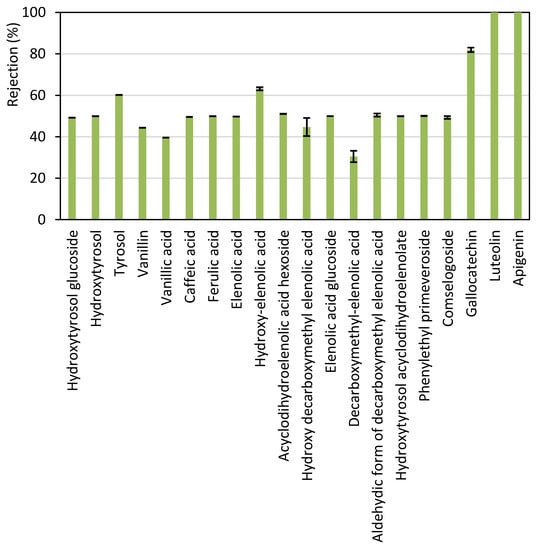 The permeate stream obtained with the UP005 membrane was analyzed by LC-ESI-qTOF-MS in order to identify the individual compounds present in the sample and the assessed rejection for each of them. This characterization provided more detailed information than the Folin–Ciocalteu methodology, which only rendered a global rejection value. Four chemical families of phenolic compounds were found in the samples. These were simple phenols (including tyrosol, hydroxytyrosol and hydroxytyrosol glucoside), phenolic acids and aldehydes (including vanillin, vanillic acid, caffeic acid and ferulic acid), secoiridoids (elenolic acid, hydroxy-elenolic acid, acyclodihydroelenolic acid, hydroxy-decarboxymethyl elenolic acid, elenolic acid glucoside, decarboxymethyl elenolic acid, aldehydic form of decarboxymethyl elenolic acid, hydroxytyrosol acyclodihydroelenolate, phenylethyl primeveroside and comselpogoside) and flavonoids (gallocatechin, luteolin and apigenin). As can be seen in Figure 3, the rejection of flavonoids by the UP005 membrane was considerably high, above 80%, in comparison with that of the rest of the compounds. Therefore, the UP005 membrane achieved fractionation of polyphenols from wet olive pomace. Flavonoids were kept in the retentate (along with a high proportion of COD from the initial extract), whereas simple phenols, phenolic acids and secoridoids were recovered in the permeate. These molecules attract great interest nowadays because of their applications in nutraceutics, pharmacy and cosmetics [46,47]. Vanillic acid and decarboxymethyl elenolic acid were the less-rejected compounds, as shown in Figure 3. The obtention of a permeate enriched in these two compounds is of high interest due to the bioactive properties attributed to these molecules. Vanillic acid is a hydroxybenzoic acid that has shown interesting pharmacological effects, such as antiviral effects against the Epstein–Barr virus [48]. Furthermore, it has been effectively used to enhance the growth of microalgae, which can be later applied as a source of nutrients [49]. In the case of decarboxymethyl elenolic acid, this molecule has demonstrated antimicrobial effects [50,51], which suggests potential applications related to these antibiotic properties.