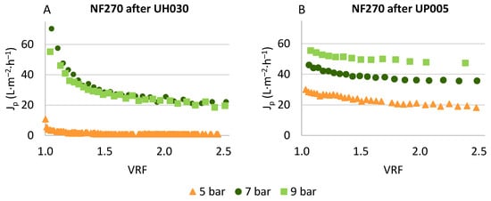 Even though the results presented in both graphs of Figure 5 correspond to the same membrane (NF270), the evolution of permeate flux was very different in each case. This is explained by the different compositions of the feed solutions, which corresponded to the ultrafiltration permeate obtained with each ultrafiltration membrane. The objective of the ultrafiltration process was to purify the phenolic compounds (recovered in the permeate of the ultrafiltration) and reject as much organic matter as possible. As reflected in Figure 3, the rejection of COD achieved by the UH030 membrane was lower than the rejection obtained with the UP005 membrane. In consequence, the NF270 membrane suffered from higher fouling during the nanofiltration of the UH030 permeate (Figure 5A). An increment of the permeate flux can be observed in Figure 5A when the transmembrane pressure was increased from 5 to 7 bar. However, no increase in the permeate flux was observed with pressures higher than 7 bar. At 9 bar, a slight increment of the flux is shown in Figure 5A, but the evolution of the permeate flux was very similar to the one obtained at 7 bar, especially at high values of the VRF. For both pressures, stable values of permeate flux of 20 ± 0.2 L·h−1·m−2·bar−1 were obtained at a VRF of 2.5. As reported previously [19,29], higher pressures lead to higher deposition of solutes on the membrane surface, contributing to concentration polarization and fouling. The constant behavior of the permeate flux with the variation of transmembrane pressure is an indicator of the formation of a fouling layer on the membrane surface [52,53], which hindered solute diffusion throughout the membrane and reduced water transport too. When the pressure was increased up to 9 bar, this layer was compacted, contributing to flux reduction. This finding was also confirmed during the cleaning stage. The cleaning of the NF270 membrane after the processing of the UH030 permeate was more difficult than after treating the UP005 permeate. The detergent P3 Ultrasil (Ecolab, Spain) at 1% (v/v) had to be employed at 35 °C in order to recover the initial permeability of the NF270 membrane when the UH030 permeate was treated.