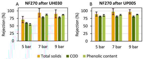 At all studied pressures, the rejection values were high, in line with those from previous works [54,55]. During the treatment of the UH030 permeate, an increment in the rejection of total solids, COD and phenolic compounds could be observed when the pressure was increased from 5 bar to 7 bar (Figure 6A). In this case, this effect cannot be attributed to the compaction of the membrane with the pressure increment, because it was initially submitted to high pressure (see Section 2.3.2) to avoid further inconsistencies during the study. Instead, the increment in the rejection can be explained by an increase in the flux of water, which was not coupled to an increment in the flux of solutes. In an NF process, the diffusion of solutes plays an essential role in solutes transport [56]. However, this diffusion is not affected by TMP [57,58], whereas the flux of the solvent (water in this case) is highly dependent on the applied pressure. Then, increasing the pressure resulted in a high increment of the flux of water, whereas the flux of solutes did not suffer such a high rise. Figure 5A supports this reasoning, as a high increment in the permeate flux was observed when the pressure increased from 5 bar to 7 bar. In consequence, at 7 bar, the rejection of total solids, COD and phenolic compounds was higher than the values observed for 5 bar. At 9 bar, the rejection values were very similar to those at 7 bar. For instance, the rejection of total phenols was 87 ± 2% at 7 bar and 87 ± 1% at 9 bar. According to Figure 5, permeate flux did not increase either. As can be inferred from Figure 6A, this last increment in pressure did not derive any improvement for the membrane performance due to membrane fouling. On the contrary, the pressure increment from 5 bar to 7 bar enhanced the permeate flux and the rejection values, leading to a more efficient process, with a higher concentration of the desired compounds.