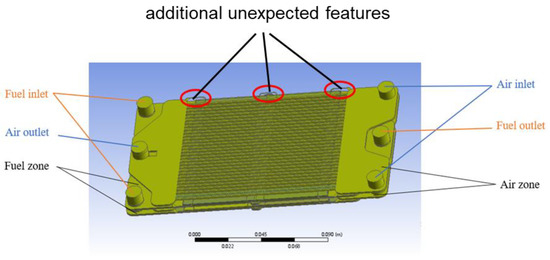 However, it can be seen from the above figure that there are some defects in the fluid domain. As the components of the reactor are not completely matched with each other during assembly, many small, unwanted features are caused in the generated fluid domain, in particular, the features near the ribs in the air zone, as shown by the red marks in Figure 2. Due to the irregular shape, these defects make the simulations unsteady and hard to converge.