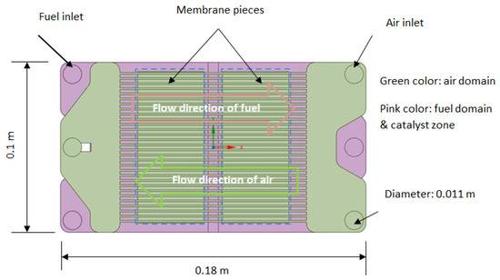 An overview of the membrane reactor prototype is shown in Figure 1. The membrane reactor consists of two layers, each of which has two cells: one is the fuel domain and the other the air domain, as shown in Figure 1a. Figure 1b displays the detailed structure and flow direction of the air domain. The membrane in each layer has two pieces with the same structure, which is for fencing off the air and fuel domains. The fuel domain can be used for various reforming reactions to produce hydrogen, such as the steam reforming of methane or methanol. The membrane can then be a palladium membrane for separating hydrogen. In contrast, the air domain can be used for the sweep gas nitrogen to remove the produced hydrogen. Alternatively, the membrane reactor can be used for the partial oxidation of hydrocarbons, where the fuel domain is used to supply hydrocarbons, and the air domain acts as the oxygen source, with the membrane serving as an ion transport membrane (ITM) for the extraction of oxygen from the air.