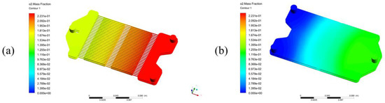 The distribution of the oxygen mass fraction under the above-described conditions in (a) the air zone and membranes, the flow direction is from right to left; and (b) the fuel zone, the flow direction is from left to right.