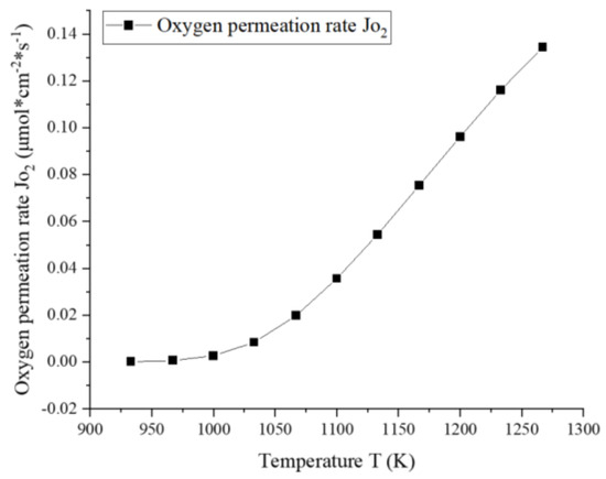 The dependence of oxygen permeation rate on temperature (, ).