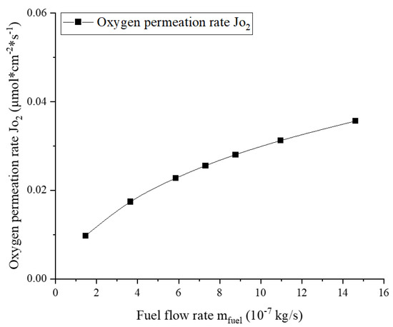 Similarly, the dependence of the oxygen permeation rate on the fuel flow is displayed in Figure 7. The simulations were carried out at with a relatively higher airflow rate of . The simulation results show that the oxygen permeation rate increases with the fuel flow rate. This is because the increased fuel stream will reduce the oxygen concentration on the permeate side and thereby reduce the oxygen pressure . This characteristic has also been confirmed by Hong et al. [19] and Habib et al. [32].