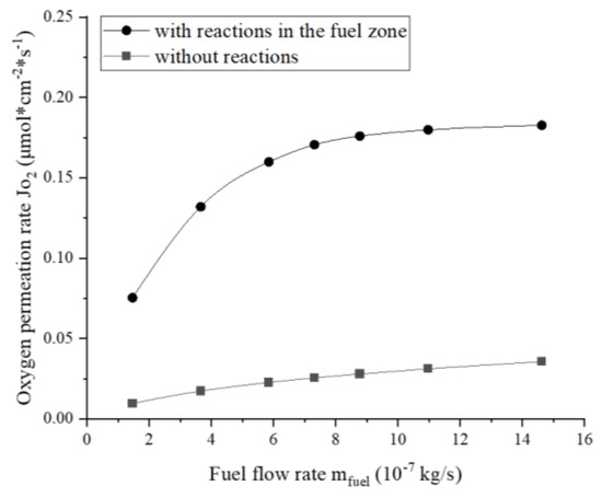 Effect of the reactions on the oxygen permeation rate at different fuel flow rates (, ).