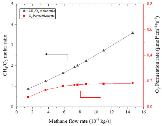 Figure 9 shows the fed methane to permeated oxygen molar ratio under different methane flow rates in the reactor. The dependence of the oxygen permeation rate on the methane flow rate is also expressed. The oxygen permeation rate increases with the methane flow rate, which is consistent with the analysis presented in the previous section. But the increased rate of permeated oxygen is very moderate, especially at higher methane flow rates, compared to the increase in the methane stream. Therefore, increasing the methane flow rate will still lead to an almost linear increase in the fed methane to the permeated oxygen molar ratio.