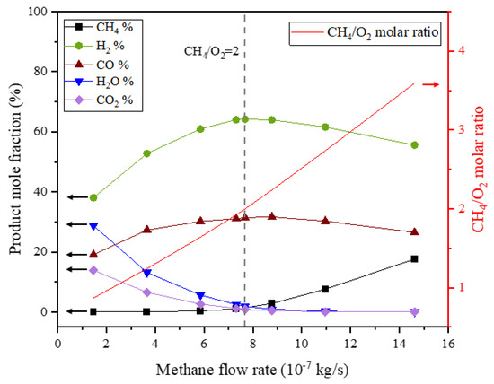 The changes in the methane flow rate lead to different product compositions in the reactor outlet, as shown in Figure 10. In all simulation cases, the oxygen was almost completely consumed, so it is not present in the product composition. The simulation results show that when the methane flow rate is relatively low, and the molar ratio of fed methane to permeated oxygen is less than 2.0, the increased methane flow rate leads to increases in CO and H2 in the product composition and consequently to decreases in CO2 and H2O, as the increased methane stream promotes reforming reactions. When the methane flow rate is relatively high, and the molar ratio of fed methane to permeated oxygen is greater than 2.0, the concentration of CO2 and H2O in the product further decreases with the increased methane stream. The increased methane flow rate simultaneously leads to a decrease in CO and H2 and an increase in methane in the product composition resulting from the dilution of the excess methane.
