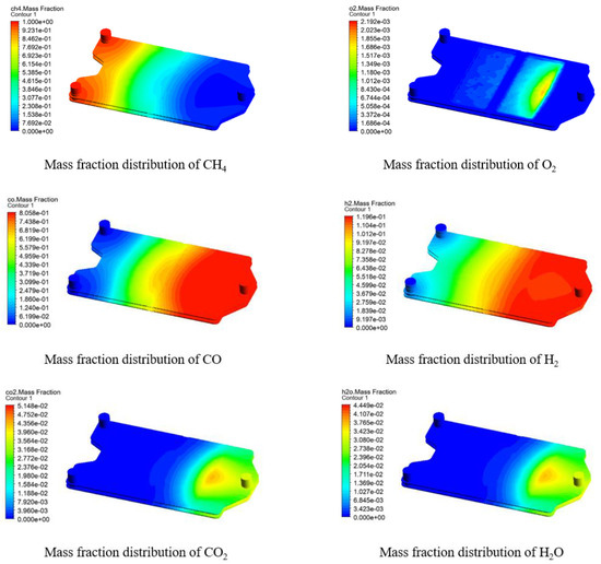 The species distribution in the fuel zone is more vividly visualized by the contours in Figure 11, which is obtained at a molar ratio of fed methane to permeated oxygen of 2.0. Because of a relatively sufficient methane feed, its mass fraction is not reduced to a low level until it reaches the middle of the fuel zone, during which the permeated oxygen is immediately consumed. After that, the consumption rate of the permeated oxygen slowed down, but the reverse process of the reforming reactions also generated methane, so the oxygen was also completely consumed. During the whole process, the mass fractions of H2 and CO both increase almost continuously due to the high methane feed. CO2 and H2O show very similar trends, with both being produced in small amounts at the membrane surface close to the outlet, as the complete oxidation of methane is predominant at this location.