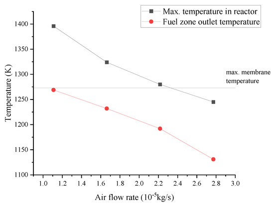 Based on the above results, the temperature of the feed air and fuel is adjusted to , and the airflow rate is increased to control the temperature in the reactor. Figure 14 shows the maximum and outlet temperature in the fuel zone with both the air and methane feed temperature of under different airflow rates. It can be seen that when the feed temperature is , the temperature difference in the fuel zone is significantly smaller compared to that at . In addition, the maximum and outlet temperature of the fuel zone decreases with the increasing air stream because the increased air quantity has improved the heat capacity of the heat removal and better cooling. However, it must be noted that the maximum allowable membrane temperature (1273 K) is taken as a reference for this analysis. In practice, the original reactor for SOC can withstand a maximum of 1100 K, which allows only isothermal operation according to the results of our simulations. In order to realize the adiabatic operation with the existing reactor geometry, either the reactor materials have to be adapted to higher temperatures for partial oxidation operation, or the feed inlet temperatures have to be reduced at the expense of poorer reactor performance.