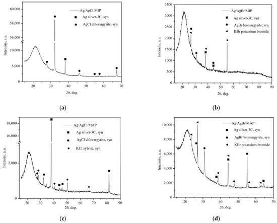 As we can see, the typical cubic phase of metallic Ag0, space group Fm-3m (225), and the cubic phases of AgCl and AgBr, space group Fm-3m (225), were formed. It should also be noted that the crystalline cubic phases of potassium halides (KCl and KBr, space group Fm-3m (225)) as not reacted component of the final stage of impregnation are also on the diffraction patterns. Thus, it can be seen that as a result of partial photolysis of silver halides a part of ionic Ag+ were reduced to metallic silver and Ag/AgHal were formed via simple impregnation procedure, which corresponds with data of the selected area electron diffraction (SAED) for similar materials reported in [31].