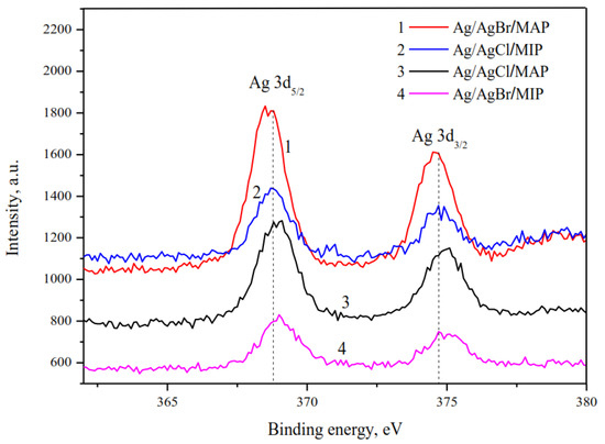 XPS analysis of the silver-doped membranes justified silver in metallic form only (Figure 2). The peaks of Ag 3d photoelectron spectrum with binding energy of 368.6–369.0 eV and 374.6–375.0 eV are assigned to Ag 3d5/2 and Ag 3d3/2 of Ag0, respectively [44,45,46]. The ionic form was not detected on the particle surface of grinded membranes in comparison with the entire volume of the sample analyzed by XRD owing to the surface photolysis of silver halides.