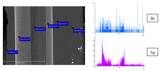 SEM images of the cross-section of the Ag/AgBr/MAP membrane, Br and Ag element distributions over thickness are presented in Figure 5. As in the case of MIP membranes, a zoned silver distribution is observed. Table 1 shows the EDX results for the surface areas pointed out in Figure 5 (Si and O content are omitted). As seen from spectra 3 and 5, the amount of potassium and chlorine are close, and the ratio of elements is almost 1:1. Silver is determined in spectra 4 and 6. The content of bromine increases with respect to the amount of potassium by the silver content or silver is in excess. In turn, only silver is detected in spectrum 7. Thus, this allows making assumptions about the formation of both silver bromide phase and metallic silver, which is consistent with XRD and XPS. Note that Ag content calculated from EDX data over membrane cross-section is in a range about 0.7–8.2 wt %. Similar regularities were observed for the Ag/AgCl/MAP membrane (Figure 6a).