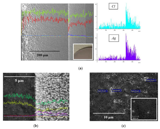 As seen from Figure 6b,c, SEM images of the Ag/AgCl/MAP cross-section demonstrate mainly the agglomerates of Ag/AgCl nanoparticles unevenly distributed over the membrane thickness. However, the individual nanoparticles (Figure 6b,c) with average size about 30 nm are also observed. It is obvious that the results of EDX and SEM analysis are consistent with each other. Indeed, the number of particles grows dramatically from a near-surface zone with a small content of silver element to a zone with a maximum content. It is worth noticing that EDX data confirm modification of the pore space of the MAP membranes accompanied by a change in their visual transparence (Figure 3b, Figure 5 and Figure 6a).