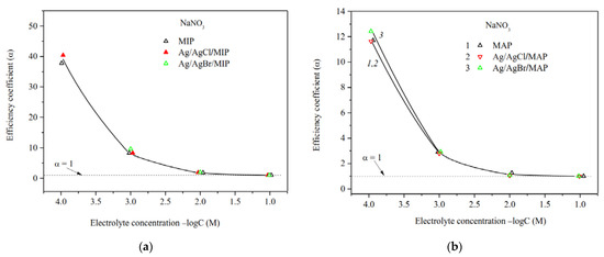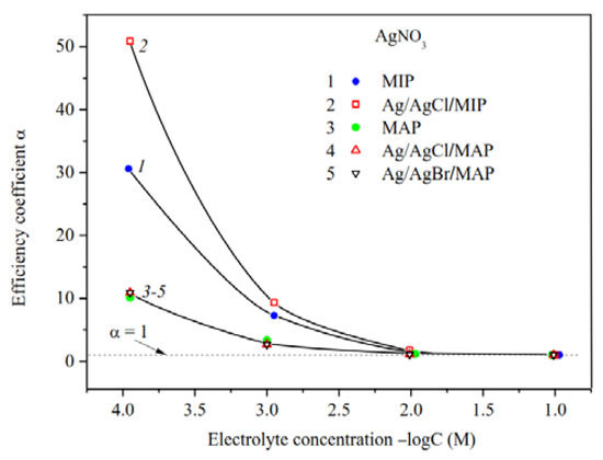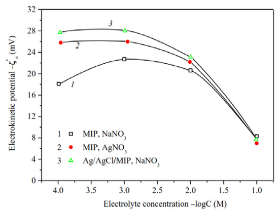The analysis of the concentration dependences of the efficiency coefficient in indifferent electrolyte NaNO3 showed (Figure 7a,b) that α values for the base MIP and MAP membranes and Ag/AgHal-doped ones (including Ag/AgI-modified mesoporous membranes, see [34]) almost coincide within the experimental error. In this regard, in a case of the MIP composites in which the Ag/AgHal content is less compared to MAP ones, we have studied further only electrokinetic properties of the Ag/AgCl/MIP membrane.