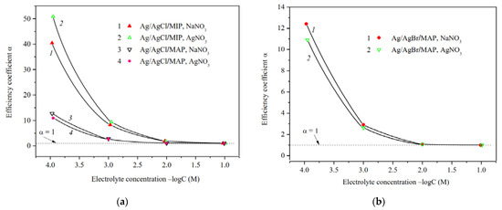 Efficiency coefficients of Ag/AgCl-doped MIP and MAP membranes (a) and Ag/AgBr/MAP (b) membranes vs. NaNO3 and AgNO3 solution concentration.