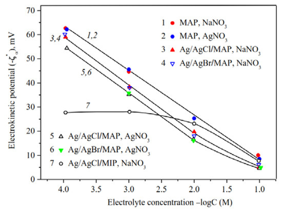 As seen from Figure 11, the concentration dependencies of zeta-potential are linear over the chosen electrolyte concentration range for the base macroporous matrices and at C < 10−2 M for Ag/AgHal/MAP membranes, which coincides with the theoretical concepts about the EDL structure at the interface of the oxide material and electrolyte solution.