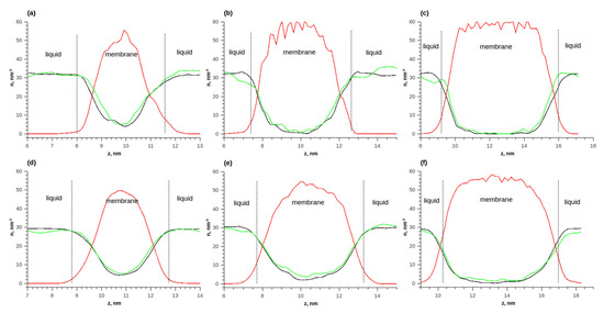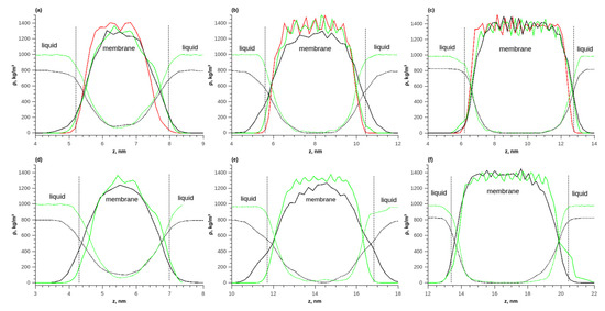 The density distributions of components along the length of the simulated cell during the adsorption of ethanol–water equimolar mixture on the membrane; (a) T = 298 K, 1 layer; (b) T = 298 K, 2 layers; (c) T = 298 K, 3 layers; (d) T = 353 K, 1 layer; (e) T = 353 K, 2 layers; (f) T = 353 K, 3 layers. Solid red line—polymer density in vacuum, solid green line—polymer density during water adsorption, solid red line—polymer density, solid green line—water density, and solid black line—ethanol density.