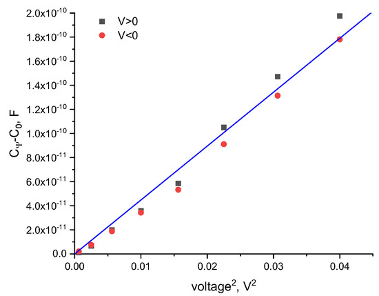 Following Equation (3), a plot of the constant-volume capacitance against the square of the applied voltage results in a linear correlation, where is the slope. We determine from the linear fit of the voltage-dependent volume vs. the voltage squared, as shown in Figure 1. By applying equal increasing positive and negative voltage it is apparent that, for symmetric bilayers in symmetric aqueous phase environments, the data overlays, as expected.
