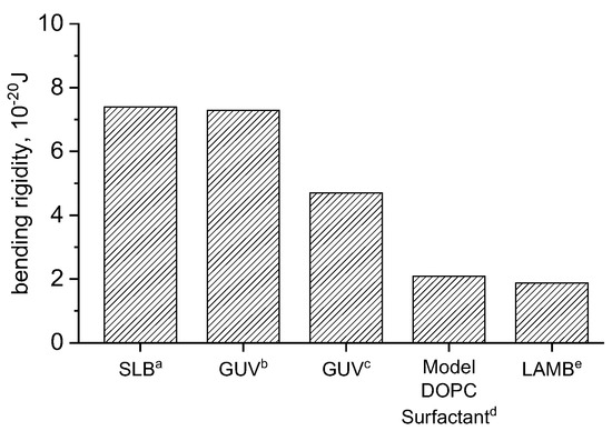 The area expansion modulus and subsequently is calculated according to Equations (7) and (8) for DOPC in 150 mM NaCl, 2 mM CaCl2, and 0.2 mM NaHCO3, and compared to similar experimental and simulations results (Figure 3). The result is in good agreement with simulations and slightly lower than experimental results. A study combining measurements on entropically stabilized DOPC vesicles in NaBr and self-consistent field theory [33] determined bending rigidities of 2.09 × 10−20 J. De Mel studied [12] DOPC vesicles using neutron spin echo (NSE), finding rigidities of 7.29 × 10−20 J and 13 × 10−20 J for DOPC vesicles in water and 150 mM NaCl, buffer, respectively. Studies carried out by Picas [34] in SLBs produced similar results to those of De Mel [12]. Other [35] GUV studies found values of kc ranging from 4–5.3 × 10−20 J. Our large area biomembrane (LAMB) experiments were performed in a buffer consisting of 150 mM NaCl, 2 mM CaCl2 and 0.2 mM NaHCO3. Its bending rigidity is in good agreement with values determined by Claessens [33].
