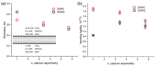 Next, the effect of the ionic solution asymmetry on membrane thickness and bending rigidity was studied for both DOPC and DOPG bilayers. Calcium chloride was added into the top chamber to increase its concentration from 2 mM to 11.4 mM, while keeping the solution conditions constant on the opposite side of the membrane ([Ca2+] = 2 mM). We define the calcium ionic strength asymmetry factor, x, which is the ratio between the calcium concentration on the top and bottom aqueous chambers. This factor ranges from 1 for symmetric conditions to nearly 6 in our experiments. The hydrophobic thicknesses of DOPC (2.69 nm)and DOPG (2.84 nm) bilayers in symmetric solution conditions agree with our previous results using squalene [22] and approaches the solvent-free limit measured by others [41,42] (Figure 4a). Asymmetric calcium conditions result in a similar thinning of the membrane for both DOPC and DOPG. In contrast, we find the effect of asymmetric calcium concentration to have different effects on the bending rigidity depending on the lipid charge (Figure 4b). The bending rigidity of DOPC decreases approximately 25% from 1.9 × 10−20 J to 1.4 × 10−20 J. The bending rigidity of DOPG under symmetric aqueous conditions agrees well with off-specular neutron scattering of multilayer stacks [43], albeit with different ionic and hydration conditions. Bolik’s stacked bilayers exist at an air interface, with 100% relative humidity, while ours are surrounded by aqueous buffer. Upon introducing asymmetry in calcium concentration, the bending rigidity of DOPG increased by 50%, from 0.8 × 10−20 J to 1.2 × 10−20.