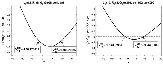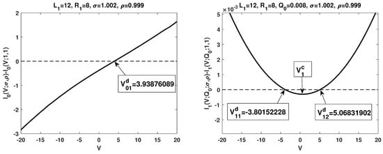 - The term , as a quadratic function, under our setup, it is concave up with two zeros and . At , the critical point, attains its global minimum. Furthermore, (respectively, ) for (respectively, ); is increasing for while it is decreasing for . The numerical results are consistent with the first statement in Theorem 2 and Theorem 3, respectively (see the right figure in Figure 1).