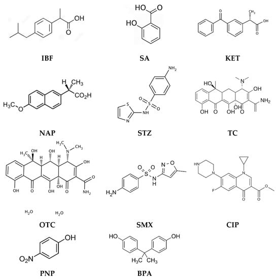 Table 1 shows examples of the use of PIMs for the removal of pharmaceuticals and endocrine-disrupting compounds, such as IBF, SA, KET, NAP, sulphathiazole (STZ), TC, oxytetracyline (OTC), SMX, and also CIP, PNP, and BPA (Figure 1).