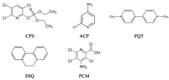 According to the World Health Organization, pesticides are chemical compounds used to fight parasites, including insects, rodents, fungi, and weeds. A lot of pesticides released into the environment have been defined as toxic, persistent, bioaccumulative, and harmful to the health of the entire ecosystem, including humans [50]. Depending on the type of pesticide and the nature of the environmental sample, various methods are used to determine the content of these compounds, to identify them, and finally to remove pesticides (e.g., solvent extraction (SE), Solid-Phase Extraction (SPE), Solid-Phase Microextraction (SPME), High-Resolution Mass Spectrometry (HRMS), chromatography-based methods, etc.), however, all these solutions have certain limitations (e.g., SE—consumption of large amounts of toxic solvents) [50,51]. Therefore, other solutions are sought. Methods based on the use of PIMs are becoming increasingly popular because they are environmentally friendly, efficient, and selective and allow the removal of even small amounts of pesticides from aqueous solutions. Examples of removal of various pesticides, e.g., chlorpyrifos (CPS), 4-amino-2-chloropyridine (ACP), paraquat (PQT), diquat (DIQ), and picloram herbicides (4-amino-3,5,6-trichloro-2-pyridinecarboxylic acid) (PCM) (Figure 2) by methods based on the application of PIMs, are shown in Table 2.